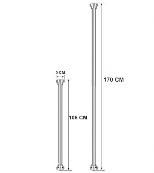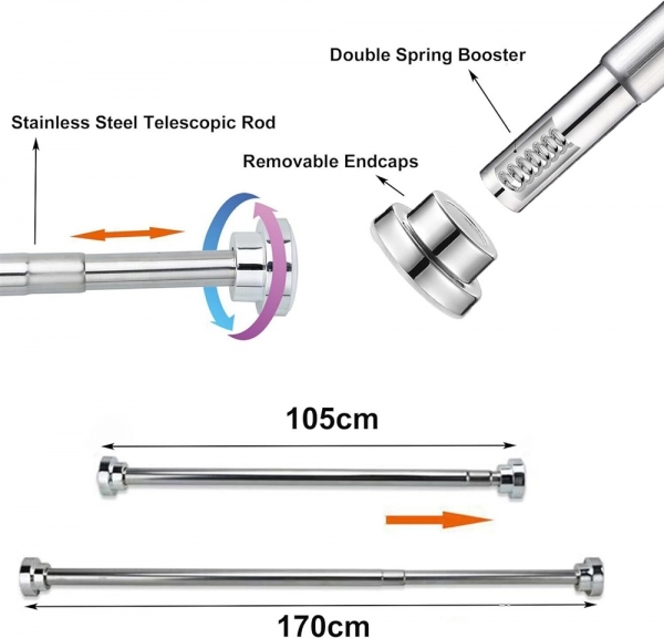 Instalare fara efort: nu sunt necesare unelte, suruburi, gauri sau gauriri pentru instalare. Tija este reglabila pentru a se potrivi perfect intre peretii opusi de dus sau cada, cu dimensiuni cuprinse intre 105-170cm. Tot ce aveti nevoie sunt doi pereti opusi pentru a fixa tija si pur si simplu rasuciti capetele in directii opuse pentru a extinde sau a scurta lungimea acesteia.