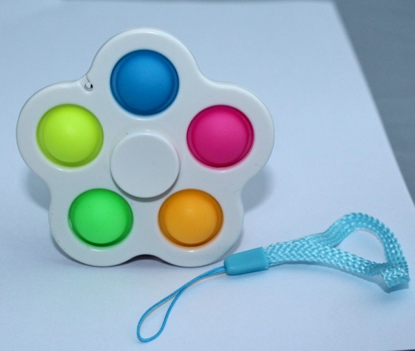 Breloc Fidget Spinner/Pop It, antistres, este formata dintr-un cadru de plastic ce sustine 5 buline colorate din silicon de inalta calitate ce poate fi utilizat in siguranta datorita materialelor sigure.