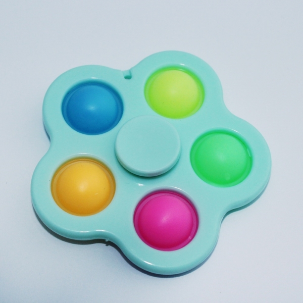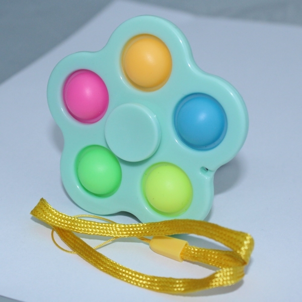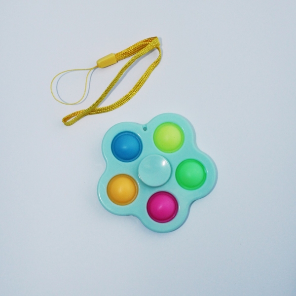 Breloc Fidget Spinner/Pop It, antistres, este formata dintr-un cadru de plastic ce sustine 5 buline colorate din silicon de inalta calitate ce poate fi utilizat in siguranta datorita materialelor sigure.