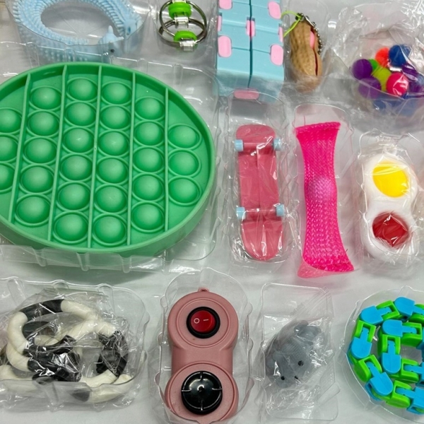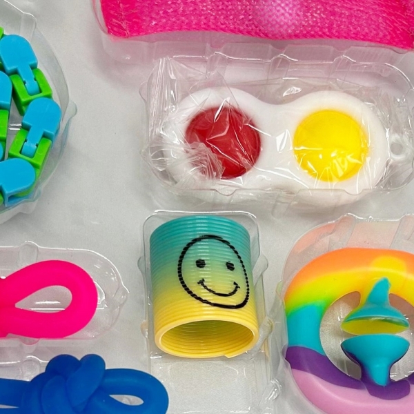 Include articole precum mingi de stres, jucarii pop-it si multe altele.