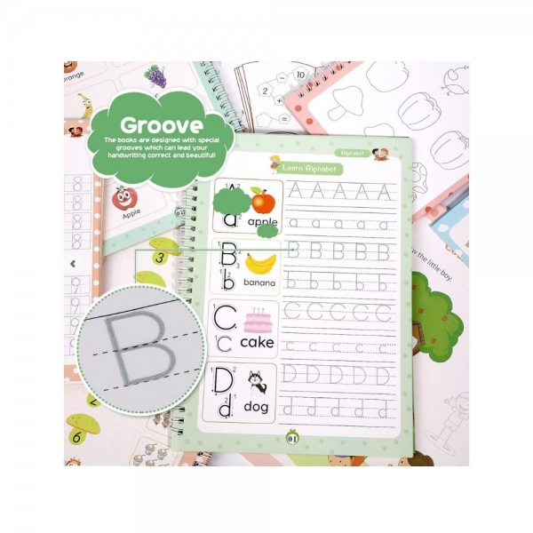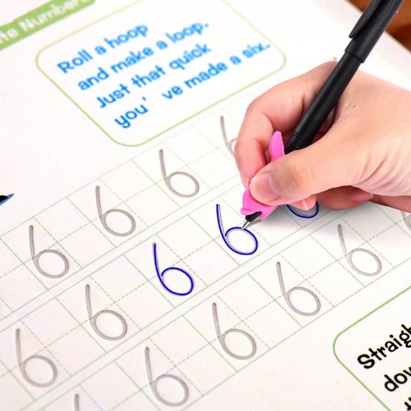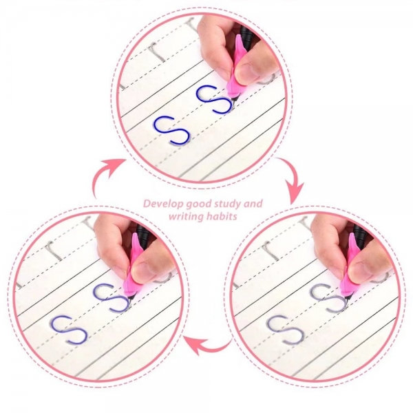 Corectie pentru prinderea stiloului: Fiecare carte include instructiuni detaliate despre prinderea corecta a stiloului, precum si un ajutor pentru scris de mana din silicon pentru a ajuta copiii sa invete tehnica corecta.