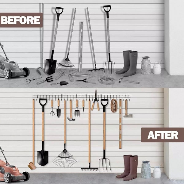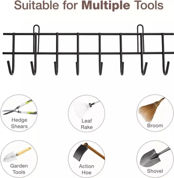 Constructie integrala din metal: Organizatorul nostru de scule de gradina este realizat in intregime din fier, oferind durabilitate si rezistenta excelente. Spre deosebire de carligele ABS standard, capacitatea sa de incarcare este semnificativ mai mare. Ideal pentru agatarea diverselor unelte, cum ar fi lopeti, greble, biciclete, maturi si mopuri. Ceea ce vedeti este ceea ce obtineti si, daca nu sunteti multumit, echipa noastra de servicii pentru clienti este aici pentru a va ajuta.