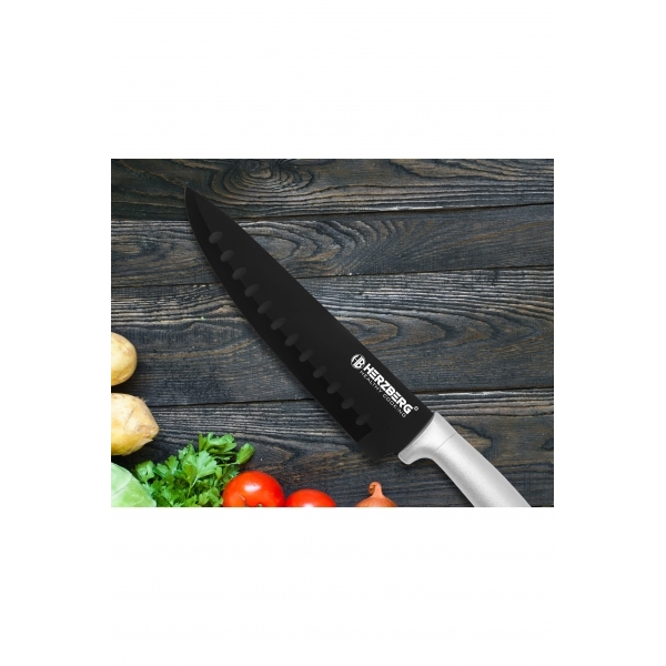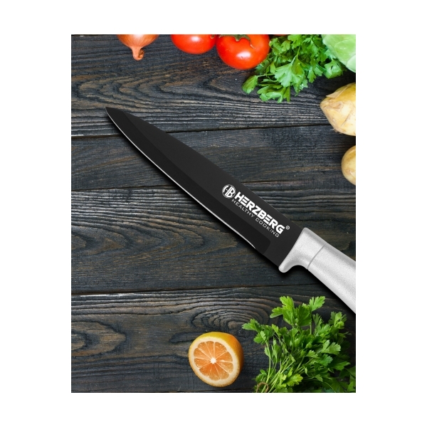 Herzberg HG-MSN8RD este un set de cutite de baza din otel inoxidabil din 8 piese, cu un strat antiaderent si un suport din acril.