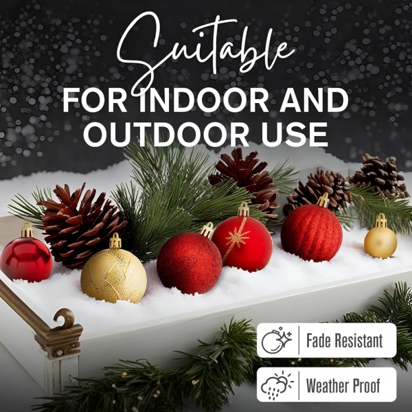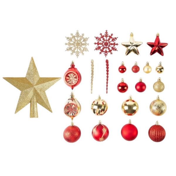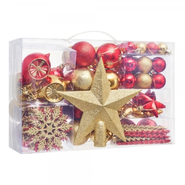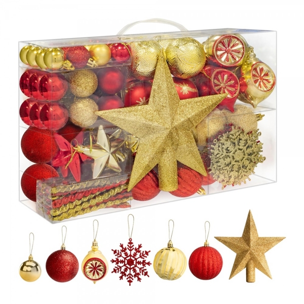 Set complet: 108 piese, inclusiv 22 de tipuri unice de mingi, fulgi de nea si stele in culori elegante rosu si auriu.