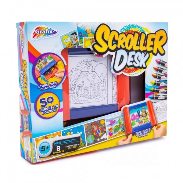 Set rola de colorat Scroller Desk cu 8 creioane si cu 50 de desene, Grafix R03-0125